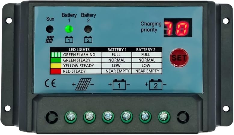 - Solar Charge Controller for managing battery charging which helps to increase a batteries lifetime by preventing overcharging