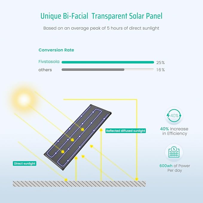 - 【Bifacial Solar Panel】FivstaSola has a unique double-sided power generation technology that not only makes full use of frontal sunlight, but also makes use of the sun’s rays reflected from the ground, which can increase the efficiency by 40% when taking full advantage of the light.