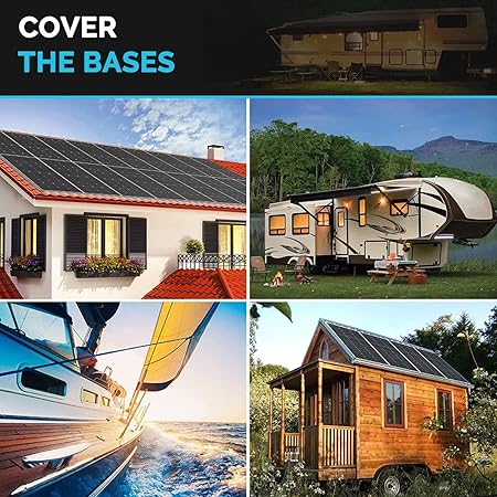 - 【Scope of Application】This solar panel kit is perfect for RV, boat, sail, yacht, truck, car, coach, cabin, RV, tent, trailer, golf cart or any other uneven surface.