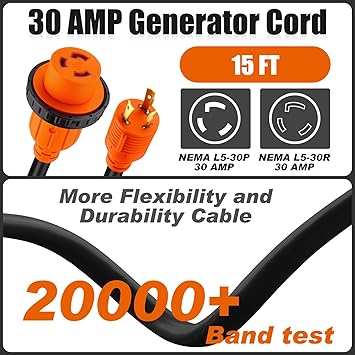 - ETL Listed 30 Amp Generator Cord: our 15ft 30 amp generator cord is ETL listed and built for reliability and featuring L5-30P male to L5-30R female with locking connectors; Constructed with all-copper wires for quality conductivity and coated in a high-density PVC jacket, this power cord is sturdy, flame retardancy, and UV resistance; Ideal for maintaining a continuous power supply during power shortages or severe weather conditions and also keep your generator running smoothly