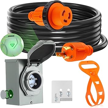 - Bright Color and Flip Cover: rv power cord features grip handles for safe, easy handling and quick disconnections and Its bright orange color enhances visibility in low-light or dark conditions; Generator inlet box features a secure flip cover that protects against dust, debris and weather elements, while the green performance indicator shows the box’s operational status; Generator power organizer combo kit improves functionality and safety