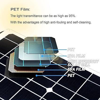 - ▲【Ultra-Thin and Ultra-Lightweight】:Use the advanced PET materials, portable solar panels are 70% lighter than traditional solar panels, making transportation and installation a breeze.The backplane adopts TPT, which has good heat dissipation, waterproof, high temperature resistance and easy cleaning.