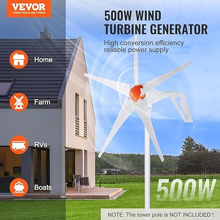 - 500W High-Efficiency Output: VEVOR 500W high-power wind turbine generator delivers exceptional wind energy utilization and efficiency, making it a versatile solution for powering various applications from homes to farms, RVs, boats, and more. (NOTE: The tower pole is NOT INCLUDED ! )