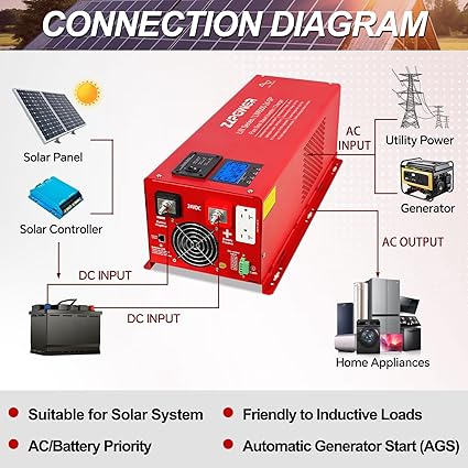 - 🌞💡【Diverse Functionality】: The charging current is adjustable from 0% to 100%. Five DIP switch settings are available to configure utility/battery priority, low battery trip voltage, AC input range, output frequency setting, and power saver setting. It features Automatic Generator Start (AGS) and an automatic transfer-switch between AC sources and battery sources.