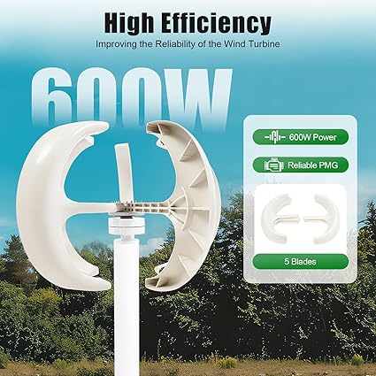 - 【High Efficiency】The powerful 600W, 6.56 ft/s start-up wind speed, 42.65 ft/s rated wind speed, 147.64 ft/s survival wind speed, and 5 blades allow for fast startup and high wind energy utilization.