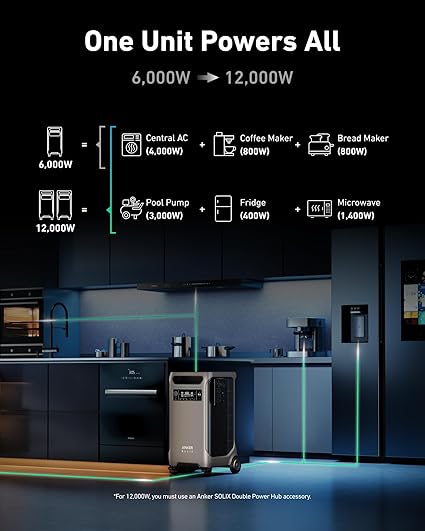 - Expandable Capacity from 3.84kWh: One Anker SOLIX F3800 has 3.84kWh to power your family’s needs for one day. Add up to 6 batteries for 26.9kWh or another F3800 and 12 batteries for up to 2 weeks of power.