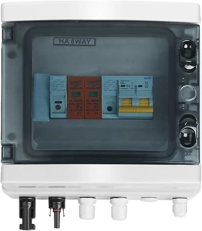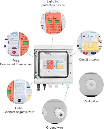 - [Solar Combiner Box]: solar photovoltaic combiner box is equipped with photovoltaic special high-voltage arrester, DC fuse box fuse and DC circuit breaker, providing multiple protections such as overvoltage, overload, lightning protection, etc.
