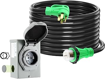 - User Centric Design: the locking ring and the finger grip on the male plug, utilizing the power cord becomes a breeze, allowing for seamless and efficient use in various settings; Enhanced safety with easy to find green design stands out against dark surfaces, helping to prevent accidents in garages, gardens, and dimly lit spaces; 50 amp generator inlet box is equipped with a secure green indicator on the flip cover, ensuring optimal performance and enhanced safety
