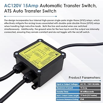 - [Product Parameters] Input or Output Voltage: AC 90 – 135V 50/60Hz. Maximum Current: 15 Amp. Transfer Time: 30 milliseconds. For most smart devices or computers, a 30ms switching action will not impact their normal functionality.