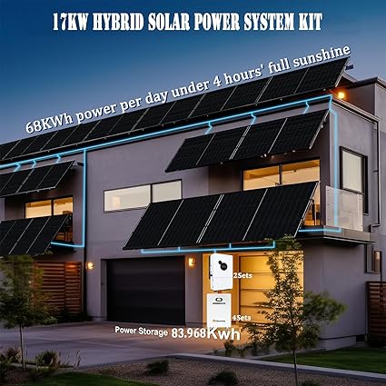 - 【High – Power Generation Capacity】This 17KW system can generate 68KWh power per day under 4 hours’ full sunshine, perfect for home, shed, cabin, farm or as other energy backup. They can also provide enough power for portable AC, air condition, TV, refrigerator, coffee maker, microwave and other devices
