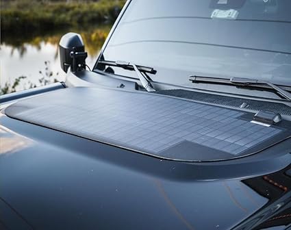 - Convenience and space-saving. The hood flexible solar panel attaches directly to the vehicle’s hood; no roof rack is needed. Unlike portable solar panels that eat up cargo space with setup and storage, it’s a plug-and-play system for easy installation.