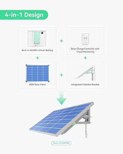 - 4-in-1 SOLAR POWER SYSTEM- The integrated solar panel, lithium battery, solar charge controller, and bracket provide a simple and efficient power solution for security cameras and IoT devices.