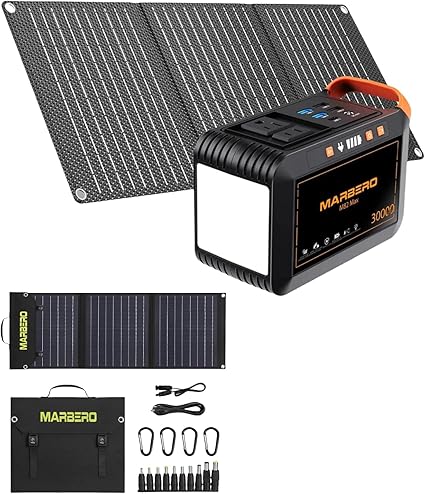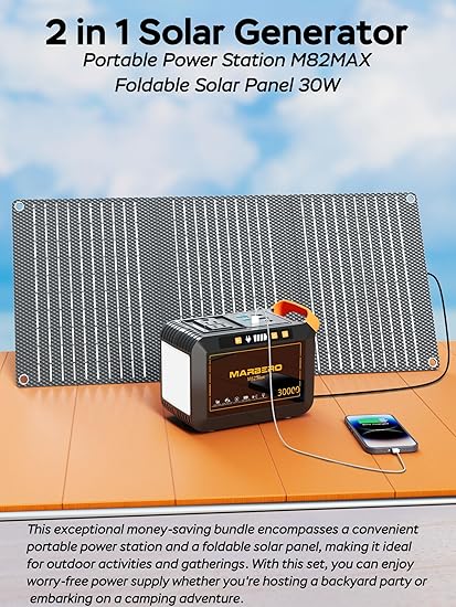 - SOLAR GENERATOR WITH SOLAR PANEL: Looking for a reliable power solution for your outdoor adventures? Look no further than the MARBERO Solar Generator M82MAX paired with the MARBERO 30W Solar Panel. Whether you’re camping in the wilderness or embarking on a road trip, this powerful duo ensures you have access to electricity wherever you go. With its large capacity, this portable power kit is perfect for overnight stays or extended periods off the grid. Say goodbye to worrying about charging your