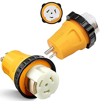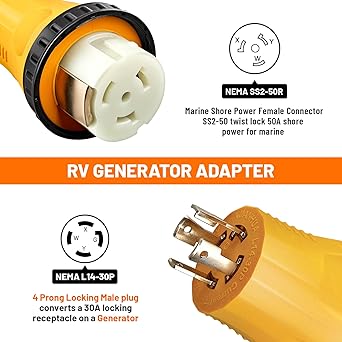 - L14-30P to SS2-50R: – NEMA L14-30P to NEMA SS2-50R ( L14-30P to CS6364C) RV/Marine Adapter; Twist locking 4 prong 30amp generator L14-30P to 50amp RV/Marine female adapter; Electronic Power: support max 30 Amp overload, 125/250V