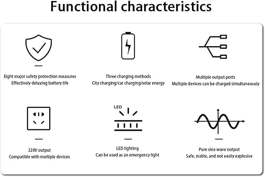 - 【AC Output】Continuous outdoor power supply, outdoor camping, long distance travel, home travel and other scenarios can simultaneously meet various outdoor power needs, such as rice cookers, lighting, car refrigerators, etc.
