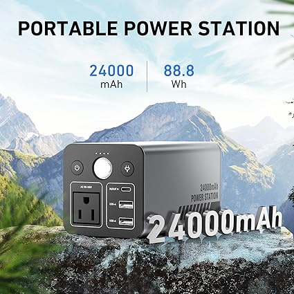 - 【24000mAh / 88.8Wh Larger capacity】Portable Power Bank with AC outlet equipment with 24000mAh battery pack with ac outlet, 2 USB-A 18W max, 1 USB-C 35W 20V 1.75A port, 1 110V 100W Ac charger station plug in port, Portable outlet power supply with 88.8Wh running 100W peak. Portable outlet applies to laptop,phones, tablet, camera, radio, USB powered night light, mini fan and so on below 100W.As an AC power bank it is an ideal necessity for outdoor activities.