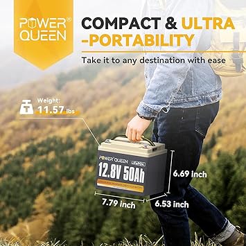- 【Power Queen Upgraded 12.8V 50Ah Pro LiFePO4 Battery】Ultra portable and lightweight with size(LWH): 7.7 * 6.5 * 6.6 inches. Weight at only 11 LBS. The New 12.8V 50Ah Pro LFP battery has the handle as well for your convenience. The portable size fits in Group 24 /27/31 battery box perfectly.