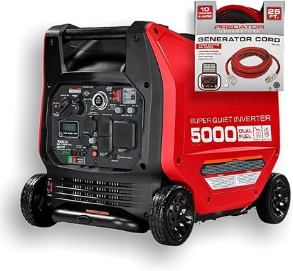| Included Components | Non-spillable 12V E-start battery, LPG connection kit, remote control, DC charging cable with clamps, spark plug wrench, and oil funnel, 5000 Watt Dual-Fuel SUPER QUIET Inverter Generator, 25 ft. x 10 Gauge Four Prong Twist-Lock 30A L14-30 Generator Extension Cord |