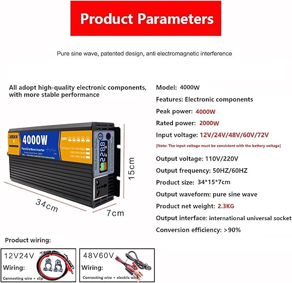 - Pure Sine Wave Inverter : The car inverter converter adopts pure sine wave technology, which has low interference, low noise and large load capacity, it is a voltage converter that converts 12V / 24V / 48V / 60V / 72V DC into 110V-120V / 220V-240V AC. You can buy inverters of the same specifications according to the voltage of the battery.It can be used in emergencies, camping, cars, homes, RVs and solar energy.