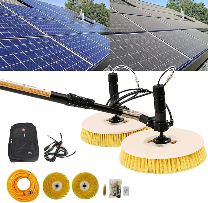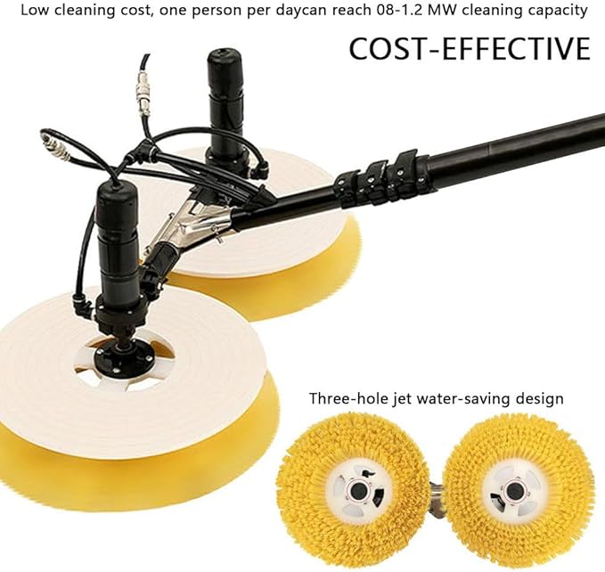 - 【AUTO WATER FEEDING】Adopts automatic water inlet design, dual brush heads rotate counter-rotating and balanced, the electric brush rotates at high speed, the friction of water spray can powerfully remove dust and dirt from photovoltaic panels.