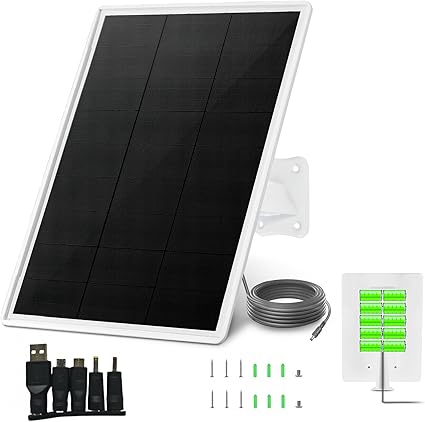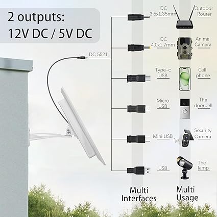 - 【Versatile Output Compatibility:】Equipped with multiple adapters including USB, Mini USB, Type-C USB, Micro USB, DC 4.0x17mm, and DC 3.5×1.35mm, enabling it to power a diverse range of devices such as animal cams, routers, cell phones, coop doors, pumps, and more. The solar panel is also compatible with battery boxes for RVs and trailers.