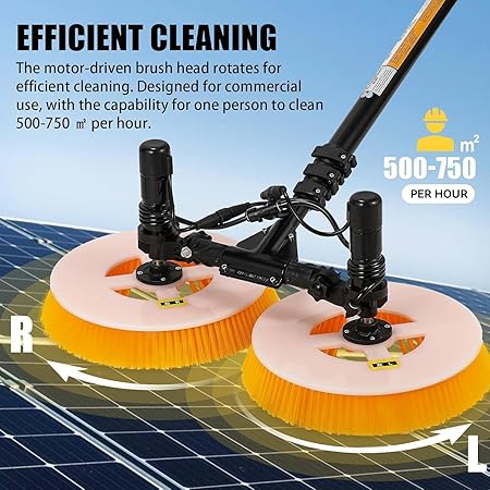 - 【High Efficiency】: the cleaning width of the cleaning devices is up to 65 cm, a single person can clean 500-750 m³ per hour. Water saving design, water consumption is about 1.5-3L/m³ and cleaning water consumption about 9-15 tonnes/mW.the opposite rotation of the double brush head is balanced, and the electric brush is rotated at high speed. The frictional force of the water spray simultaneously removes dust and sticky dirt on the photovoltaic module.
