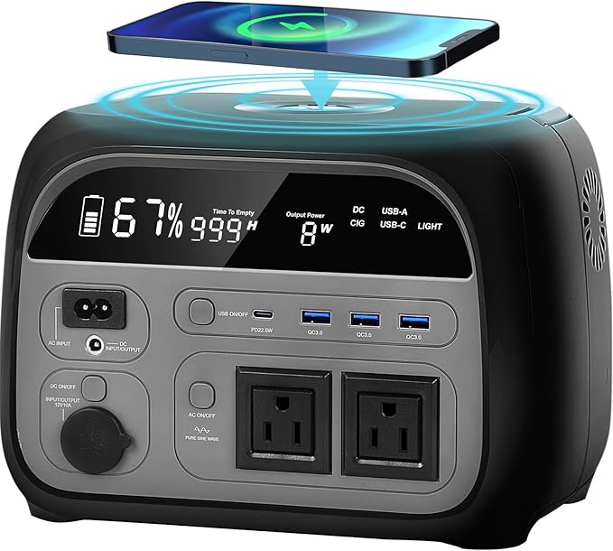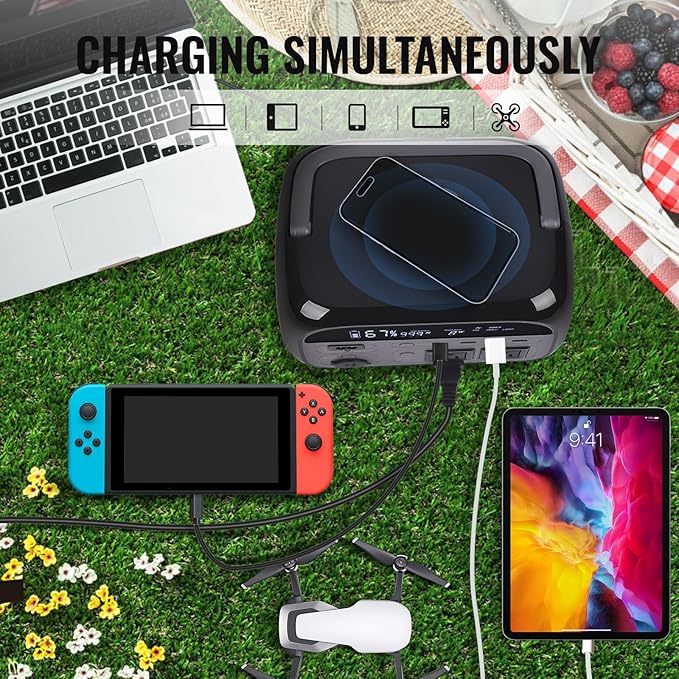 - 【MULTI-OUTPUT】- The wireless charging and 8 output ports could be used at the same time. USB ports are compatible for all the mobile phones, tablets, laptops and drones, it’s an essential unit for camping trip. The two AC output ports will power home appliances, such as small TVs, game consoles, projectors, etc. The car DC charger output will supply power to car fridge, vacuum cleaner, and air compressor, this camping battery power station will keep your essential devices powered on the go or during a home power outage