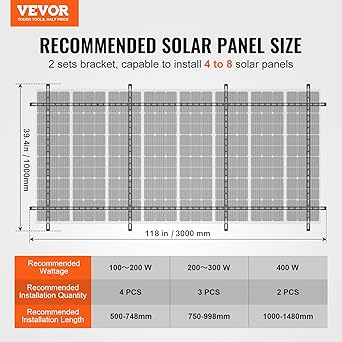 - Versatile Applicability: VEVOR 2 sets multi-piece solar panel mounting brackets support the installation of 4 to 8PCS solar panels. Single Bracket Recommended Installation Sizes: 4 panels (19.7 – 29.5 inch; 100W – 200W), 3 panels (29.5 – 39.3 inch; 200W – 300W), and 2 panels (39.4 – 58.3 inch; 400W).