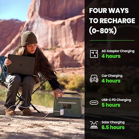 - More Ways to Recharge: Recharge faster than ever—power up to 80% in just 4 hours using a wall outlet and 100W USB-C PD port simultaneously. You can also recharge via an AC adapter, a car outlet, the USB-C PD port, or a Yoshino solar panel. The upgraded Maximum Power Point Tracking (MPPT) technology allows you to get the most power possible from your solar panels at any time. It operates with near-silent noise, as low as 38dB, bringing a peaceful charging experience.
